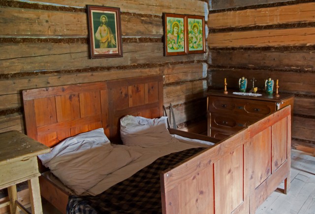07 lipca 2010 — Zabytkowe łóżko znajdujące się w jednym z pomieszczeń w chałupie wójta Maja w sidzińskim skansenie.