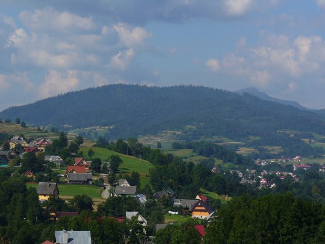 09 sierpnia 2008 — Domy tworzące niewielkie osiedle zwane "Za Górą". Dalej masyw Kiełka, w oddali Babia Góra.